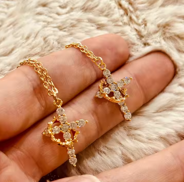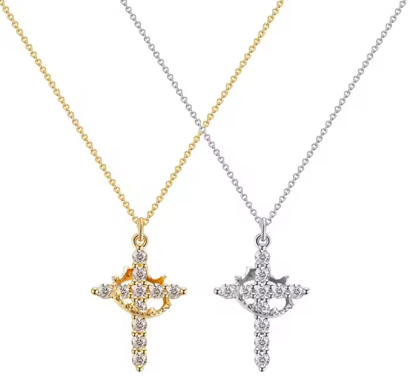 Este collar de cruz añade el elemento de una corona y atrae las miradas. La cruz simboliza la importancia de valores cristianos como el amor, la esperanza y el valor. Llevar este collar puede transmitir una actitud positiva y firme hacia tus creencias.